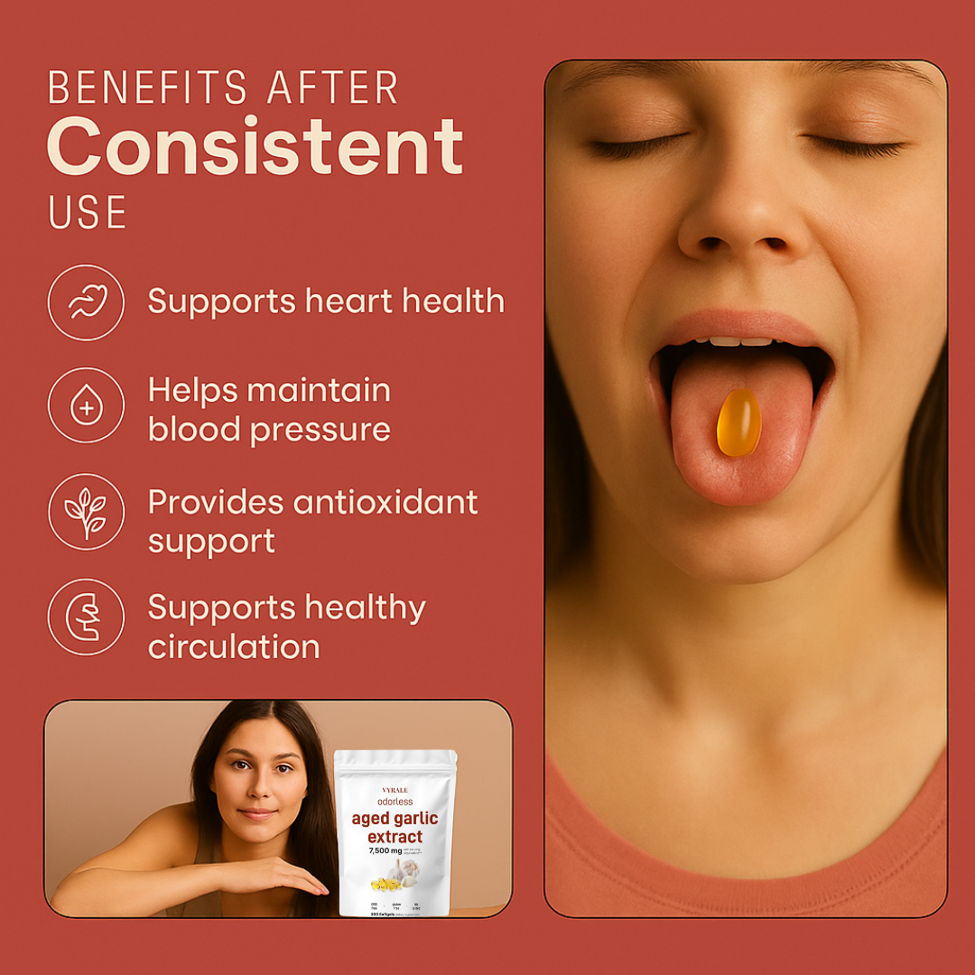 Our formula is made from high-quality garlic that’s carefully aged to preserve its beneficial compounds. It’s designed to support healthy blood pressure and overall cardiovascular wellness as part of a balanced lifestyle. Take care of your heart naturally with a supplement crafted for modern life.